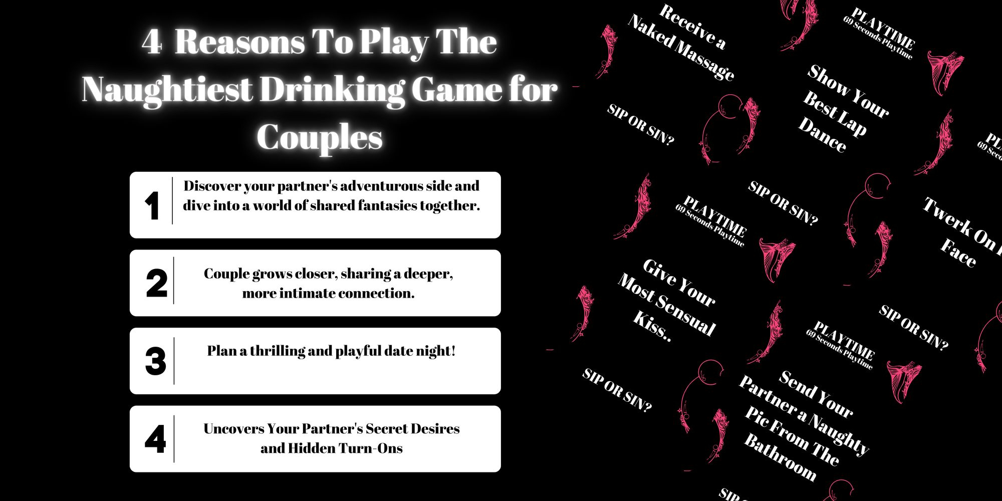Here's how to play: Start by shuffling the cards. The game has 4 categories: PLAYTIME, SIP IF, CONFESSION, and INTIMACY CHECK. Follow the card's instructions or take a sip. Ideal for 2 players with a playtime of 45-60 minutes.